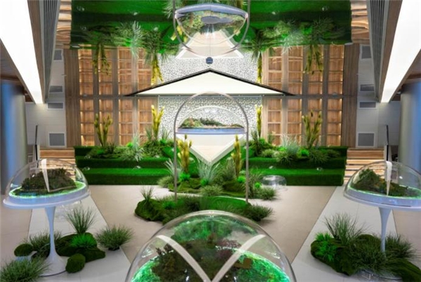 中心生態(tài)景觀區(qū)借助生態(tài)球以微縮景觀的形式呈現(xiàn)水孕育出的生態(tài)環(huán)境